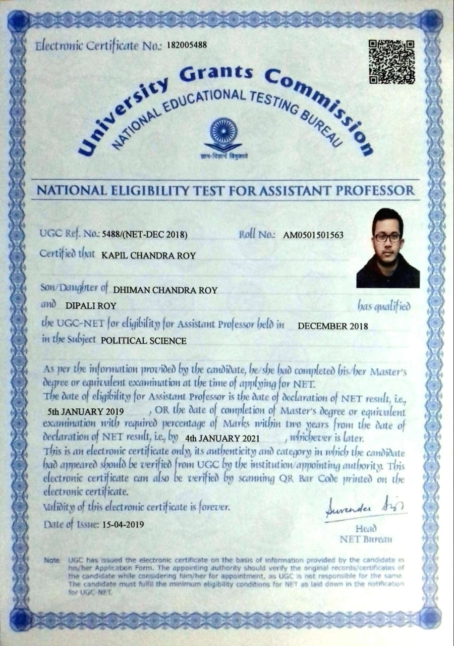 NET certificate of Kapil Chandra Roy