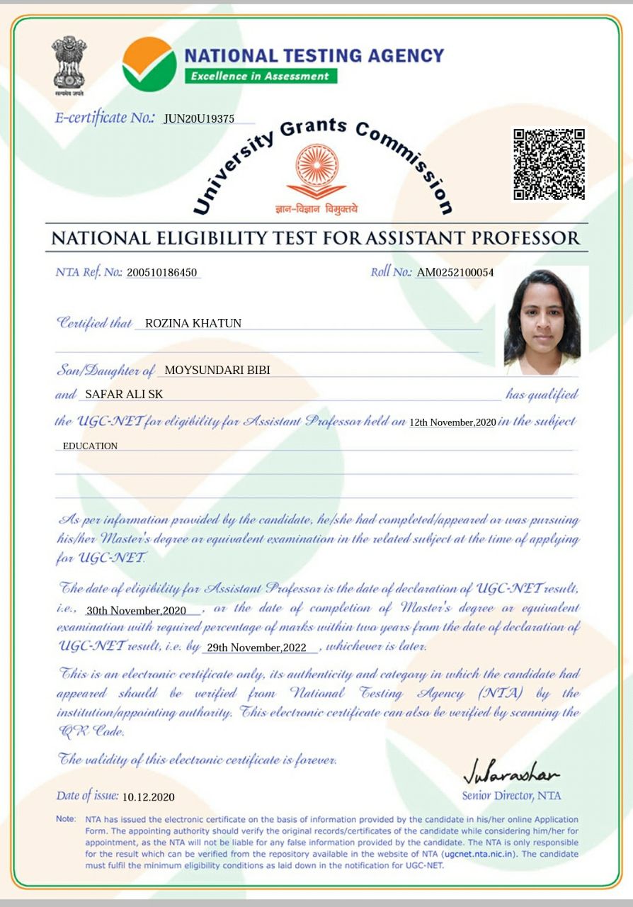 NET certificate of Rozina Khatun