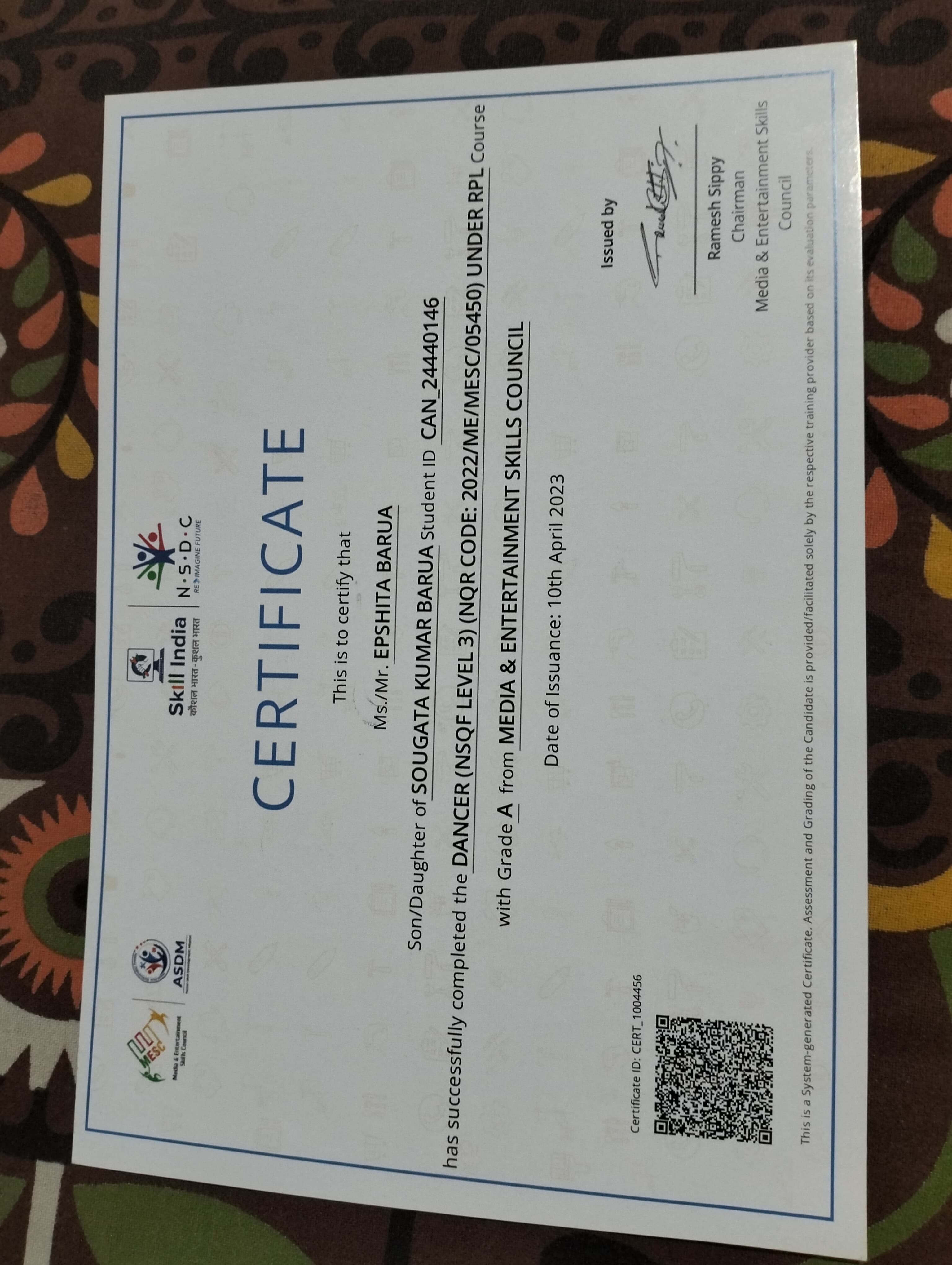 Dancer (NSQF Level 3) certificate of Epshita Barua
