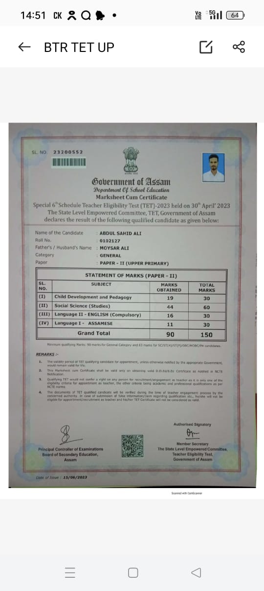 TET qualifying certificate of Moysar Ali
